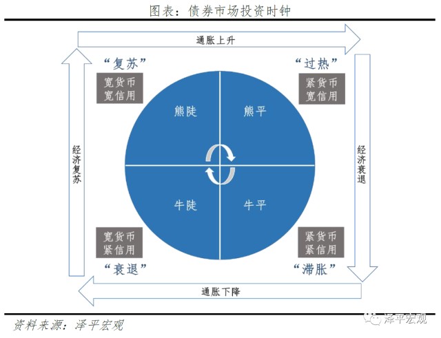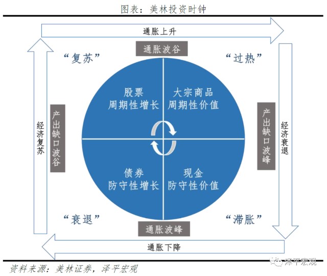 在衰退期:经济下行,产出缺口恶化,通胀下行。货币政策趋松,债券的表现最为突出。债券>现金>股票>大宗商品。 在复苏期:经济上行,产出缺口好转,通胀下行。经济转好,货币政策稳定,企业盈利改善,股票获得超额收益。股票>债券>现金>大宗商品。 在过热期:经济上行,产出缺口继续向好,通胀上行。通胀上行增加了现金的持有成本,货币政策收紧以及加息的可能性降低了债券的吸引力,商品受益于通胀的上行,明显走牛。大宗商品>股票>现金/债券。 在滞胀期:经济下行,产出缺口恶化,通胀上行。由于通胀压力,此时货币政策难以放松,同时经济下行对企业盈利形成拖累,对股票造成负面影响,基于长期配置需求,债券的吸引力提升。现金>债券>大宗商品/股票。