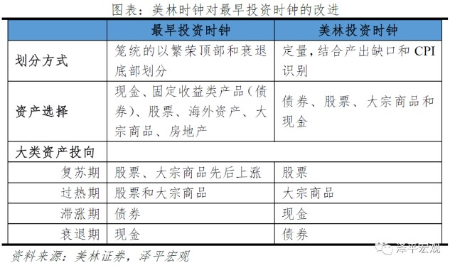 美林时钟创造了一种自上而下的投资思路。经济周期对于大类资产走势的影响,看似每个周期各有不同,实则压着相同的韵脚,改良的中国投资时钟依然有较强的理论和实践意义。