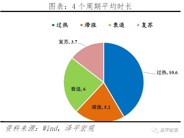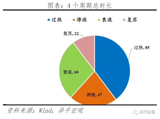 美国的复苏期和过热期是持续时间最长的两个周期。34个经济周期中,衰退期7个,复苏期11个,过热期9个,滞涨期7个。从总周期时长来看,复苏期和过热期最长,分别达274个月和139个月,滞涨期次之,达105个月,衰退期最短,为90个月。从周期平均持续时间来看,复苏期平均达25个月,过热期平均为15.5个月,滞胀期平均为15.0个月,衰退期最短为12.8个月。