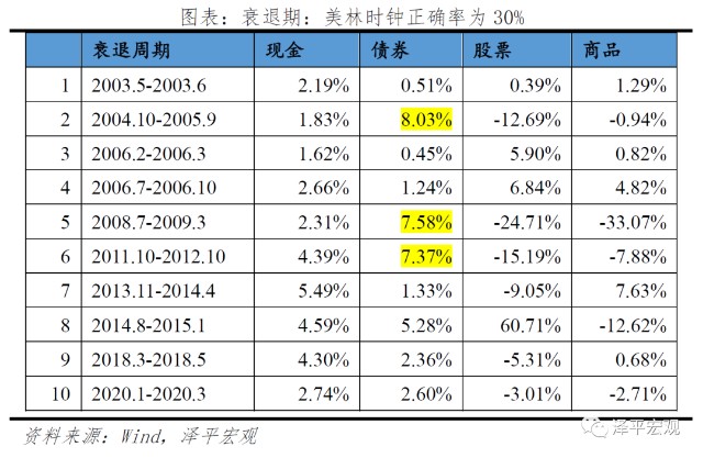 我们按照周期划分,分别检验传统美林投资时钟的大类资产收益率表现,在收益率指标方面,现金选取银行间质押式回购加权利率,债券选取中债新综合指数收益率,股票选取沪深300指数收益率,商品选择CRB现货指数收益率,测算结果如下: Ⅰ 衰退期中,美林时钟正确率仅为30%,10个小周期中仅有3个周期债券收益率表现最好,其他在衰退期表现较好的资产包括现金(3次)、股票(3次)、商品(1次)。