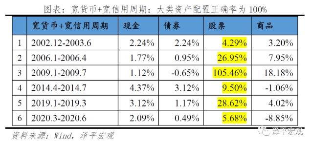 Ⅱ 宽货币+宽信用周期中,大类资产配置于股票的正确率达100%,6个小周期中,股票收益率均明显优于其他资产。