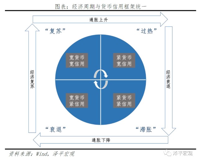 从逻辑上来说,货币和信用因素也可以与产出缺口和通胀构建的经济周期形成统一: 1)在衰退期:经济下行,产出缺口恶化、通胀下行。货币政策趋松,而实体经济融资需求较弱,广义流动性仍然较紧,对应“宽货币+紧信用”格局。 2)在复苏期:经济上行,产出缺口好转,通胀下行。随着经济转好,企业盈利改善,融资需求提升,广义流动性提升,对应“宽货币+宽信用”格局。 3)在过热期:经济上行,产出缺口继续向好,通胀上行。经济存在过热风险,央行收紧流动性,货币政策趋紧,但是此时实体经济融资需求依然旺盛,广义流动性短期难以回收,形成“紧货币+宽信用”格局。 4)在滞胀期:经济下行,产出缺口恶化,通胀上行。由于通胀压力较大,央行难以放松货币,叠加实体经济需求不振,狭义及广义流动性均较紧,形成“紧货币+紧信用”格局。
