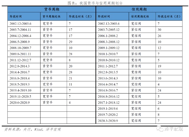但是实际上,产出缺口和通胀是货币政策的部分输入变量,而货币与信用是输出变量,且受金融监管等因素影响,在实际划分中,两者得出的经济周期结论有所不同。但我们通过测算,发现后者对于大类资产指导的正确率显著更高。 3.3.1 货币与信用的指标选择及周期划分 货币:判断狭义流动性的松紧,最简单的方式是观察银行间市场流动性。但是还有其他因素会影响银行间市场流动性,如实体经济融资需求较强时,银行间市场流动性同样趋紧,影响对于宽货币政策意图的判断。因此我们还是采用最基础的方法,即通过典型的货币政策转向操作,判断货币松紧意图的转变,作为定性判断。 结果显示,从2002年12月至2020年9月,我国货币政策共经历14个周期,其中7个宽货币周期,7个紧货币周期,宽货币周期共计89个月,平均持续12.7个月,紧货币周期共计126个月,平均持续18个月。 信用:我国自从2002年开始公布社会融资总量数据,其涵盖了主要的信用派生渠道,可以作为衡量广义流动性松紧的主要指标。但是在2016年前,社融增速的公布频率较低,难以捕捉具体月份的社融增速走势,因此我们共同参考社融增速与M2增速,判断信用走势。 结果显示,从2002年12月至2020年9月,我国信用周期共17个,其中9个宽信用周期,8个紧信用周期,宽信用周期共计83个月,平均持续9.2个月,紧信用周期共计132个月,平均持续16.5个月。