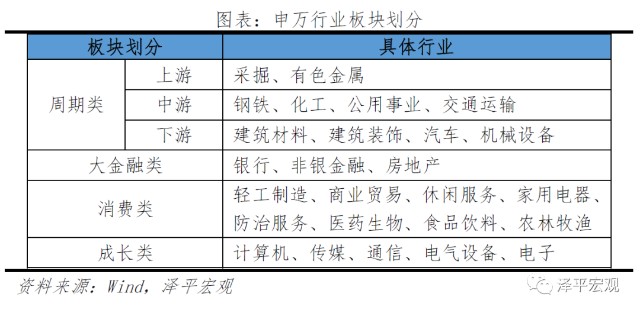 整体而言,以货币及信用因素进行划分的周期,对大类资产配置的整体准确率达到73%,在宽货币紧信用时期、宽货币宽信用时期、以及紧货币宽信用时期,均对大类资产配置有较好的指导意义。仅在紧货币紧信用周期,缺乏明确的资产配置指向。 在美林投资时钟的逻辑框架基础上,我们认为,观测货币与信用因素对于大类资产配置有着较好的指导意义。 4 周期轮动下的大类资产表现 我们通过前文研究,得出了在宏观视角下,不同的货币与信用周期组合中表现最优的大类资产类别。在这一部分,我们从中观视角出发,进一步探究在四大周期中,股票(不同行业)、债券(不同久期)以及商品(不同品种)三类资产下,具体哪一细分领域表现更优。 4.1 股票市场投资时钟 我们将申万一级行业剔除国防军工和综合后分类成周期类、大金融类、消费类、成长类四大板块,其中周期进一步细分为上中下游。根据前文货币与信用周期的时间划分,按照市值加权平均数计算区间板块年化收益率,以探索板块间轮动规律。