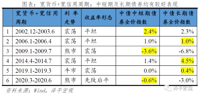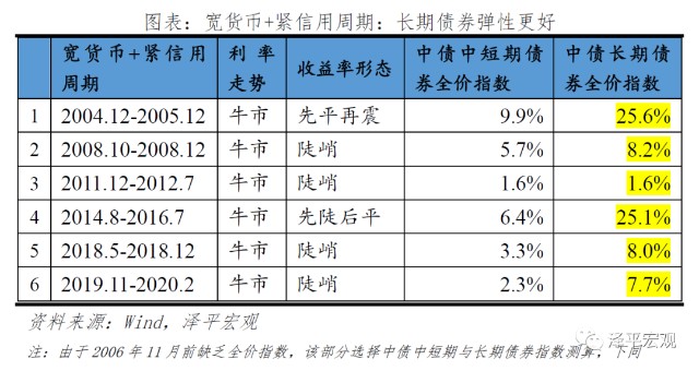 我们进一步选取中债中短期债券全价指数,及中债中长期债券全价指数,对比在不同货币与信用周期下,不同期限债券的收益率情况。数据测算显示, Ⅰ 衰退:债市100%走牛,但收益率曲线形态各有不同,配置长久期债券可以博得更高的利率下行收益。衰退期(宽货币+紧信用)严格对应债券牛市(100%),长期债券收益率显著好于短期,拉长债券久期可以博得更高的利率下行收益。