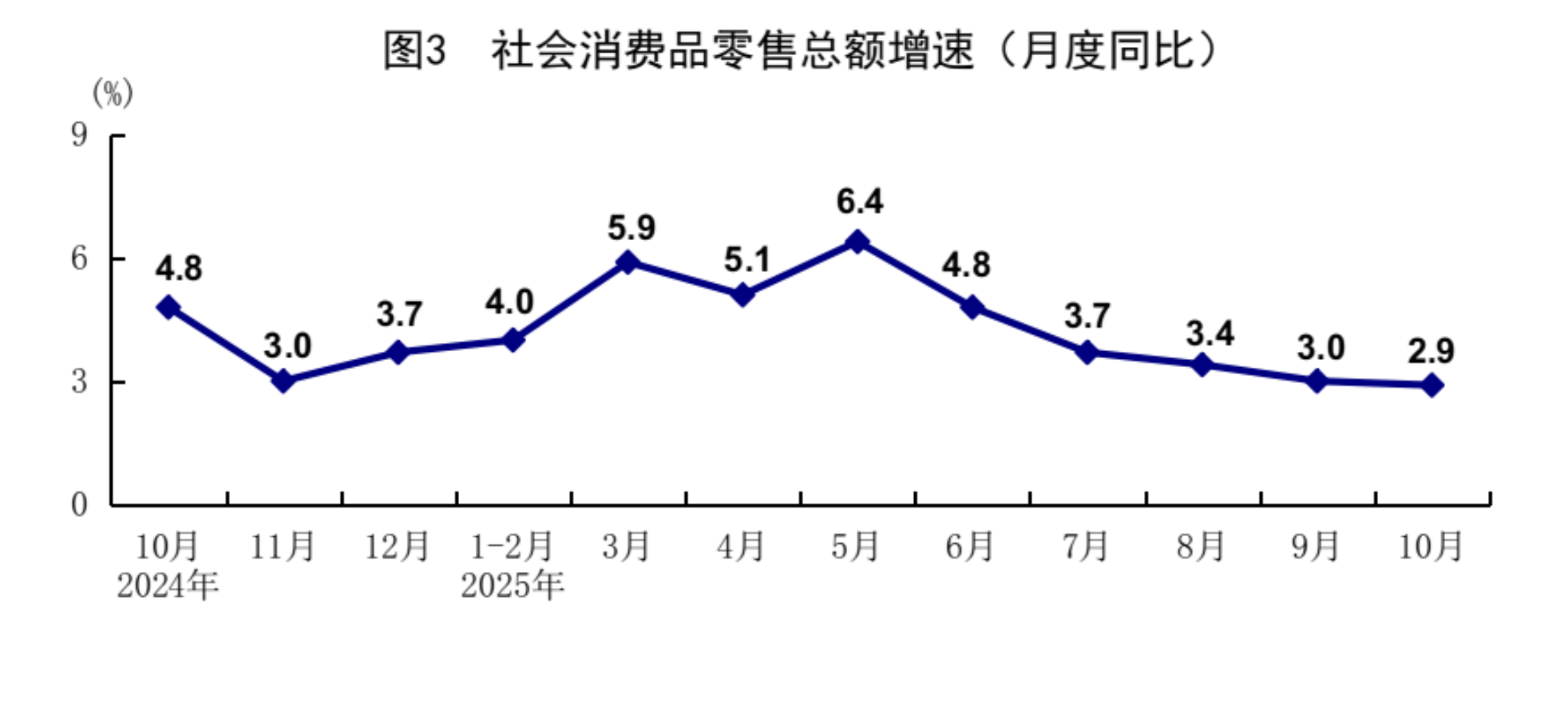 10月份,社会消费品零售总额46291亿元,同比增长2.9%;环比增长0.16%。按经营单位所在地分,城镇消费品零售额40021亿元,同比增长2.7%;乡村消费品零售额6270亿元,增长4.1%。按消费类型分,商品零售额41092亿元,增长2.8%;餐饮收入5199亿元,增长3.8%。基本生活类和部分升级类消费较快增长,限额以上单位粮油食品类、通讯器材类、文化办公用品类、体育娱乐用品类商品零售额同比分别增长9.1%、23.2%、13.5%、10.1%。1-10月份,社会消费品零售总额412169亿元,同比增长4.3%。全国网上零售额127916亿元,同比增长9.6%。其中,实物商品网上零售额103984亿元,增长6.3%,占社会消费品零售总额的比重为25.2%。1-10月份,服务零售额同比增长5.3%,增速比前三季度加快0.1个百分点。其中,文体休闲服务类、通讯信息服务类、旅游咨询租赁服务类、交通出行服务类零售额较快增长。