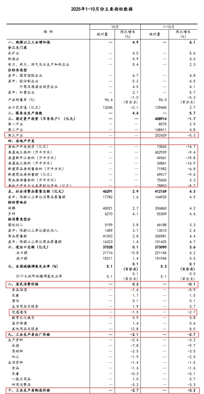进出口和就业稳得住:10 月进出口总额微涨 0.1%,1-10 月整体涨 3.6%,民营企业进出口占比超一半(57.0%);城镇调查失业率降到 5.1%,比上月降了 0.1 个百分点,就业没出大问题。【失业率数据失真,由于贸易战出口也没法看了】