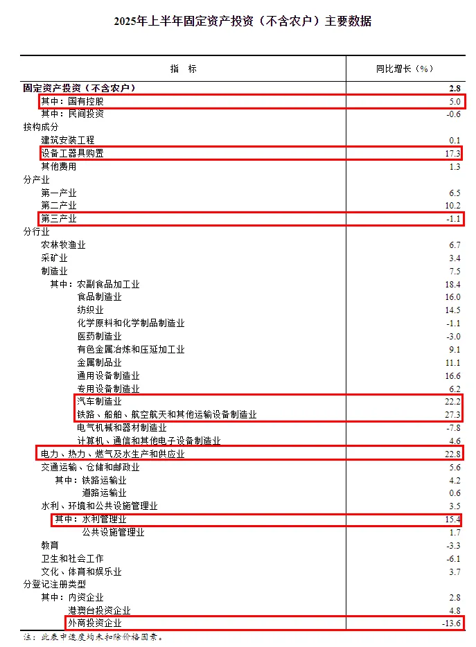 2025年上半年,全国固定资产投资(不含农户)248654亿元,同比增长2.8%(按可比口径计算,详见附注7)。其中,民间固定资产投资同比下降0.6%。扣除价格因素影响,固定资产投资(不含农户)同比增长5.3%。从环比看,6月份固定资产投资(不含农户)下降0.12%。